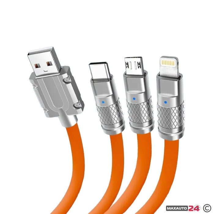 Имате ли много различни устройства вкъщи и куп кабели към тях във всички контакти? Забравете за това неудобство, този кабел е истинска находка за съвременния човек. С помощта на този кабел за телефон 3 в 1 можете едновременно да зареждате 3 различни джаджи със заряден ток до 2,4 A. Кабелът за зареждане има 3 различни типа конектори за различни устройства с конектори Lightning, Micro USB, Type C. Кабелът е подходящ за всякакви съвременни смартфони от компании като Samsung, Apple, Xiaomi, Huawei, Honor, Oppo и много други.Кабела има дължина 1,7 метра и издръжлив дизайн, който ще издържи дълго време, ако се използва правилно. Този качествен кабел 3 в 1 за зареждане на телефон е изработен от високо еластичен TPE силиконов материал, приятно за кожата усещане в ръката, анти-приплъзване.Кабелът е предназначен за зареждане и синхронизиране на данни на различни устройста - Lightning, Micro-USB и Type-C. Освен това също така ще можете да свържете вашия смартфон или плейър към вашия компютър, за да прехвърляте данни като снимки, музика или видеоклипове.Благодарение на поставения смарт чип, получавате разнообразие от методи за защита като контрол на температурата, защита от пренапрежение, защита от късо съединение, защита от свръхток и др.
